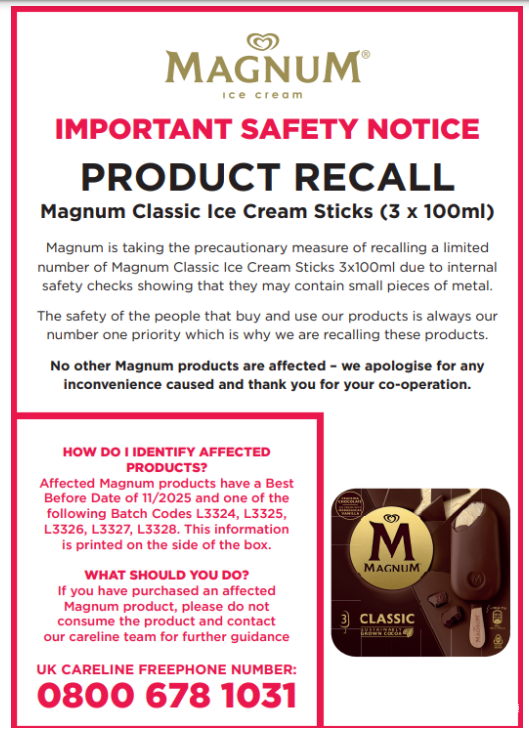 英国食品标准局官网公布的信息显示,涉事梦龙冰淇淋的规格为3x100ml,保质期至2025年11月,批号分别为L3324、L3325、L3326、L3327和L3328。