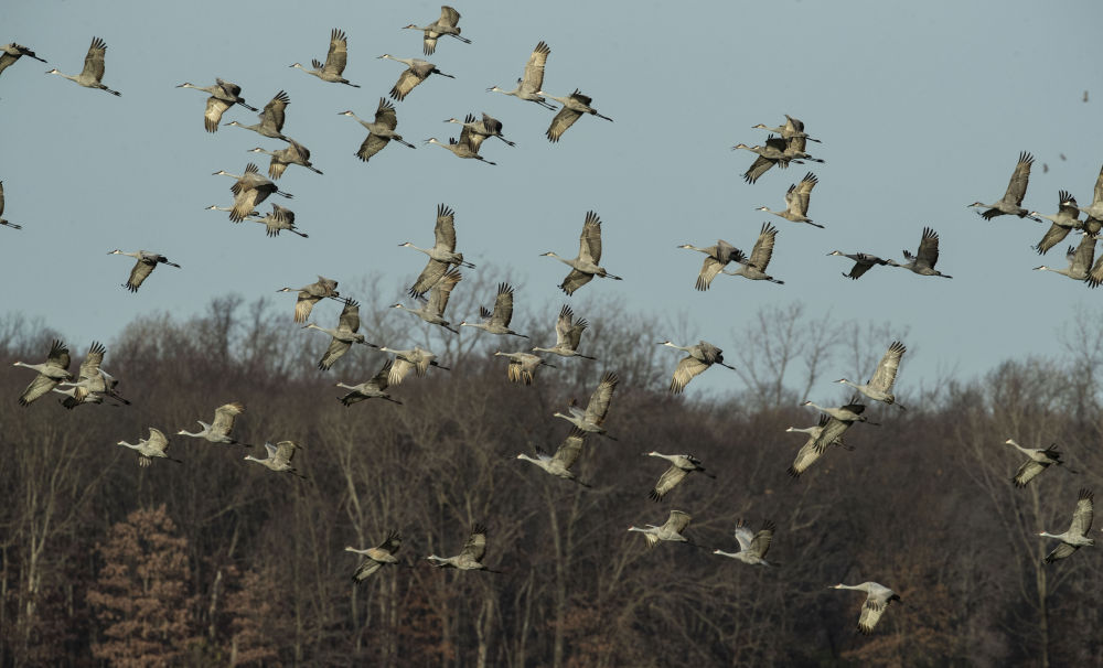 2020年11月19日,在美国印第安纳州梅达里维尔,沙丘鹤在空中飞翔。新华社发(乔尔·莱纳摄)