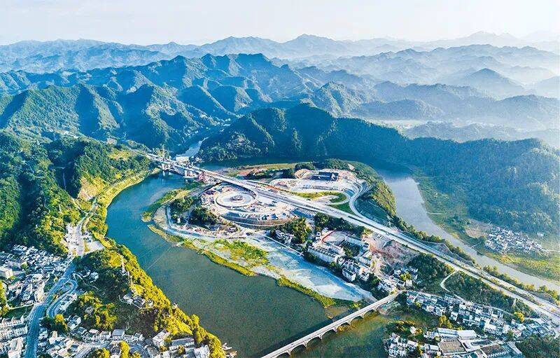 基础设施是经济社会发展的重要支撑。溧宁高速公路途经江苏、安徽、浙江、福建等地,建成通车后将进一步完善高速公路网,促进沿线地区经济社会发展。图为2022年8月5日,安徽省黄山市歙县深渡镇新安江畔在建的溧宁高速公路深渡服务区项目场景。 人民图片 肖本祥/摄