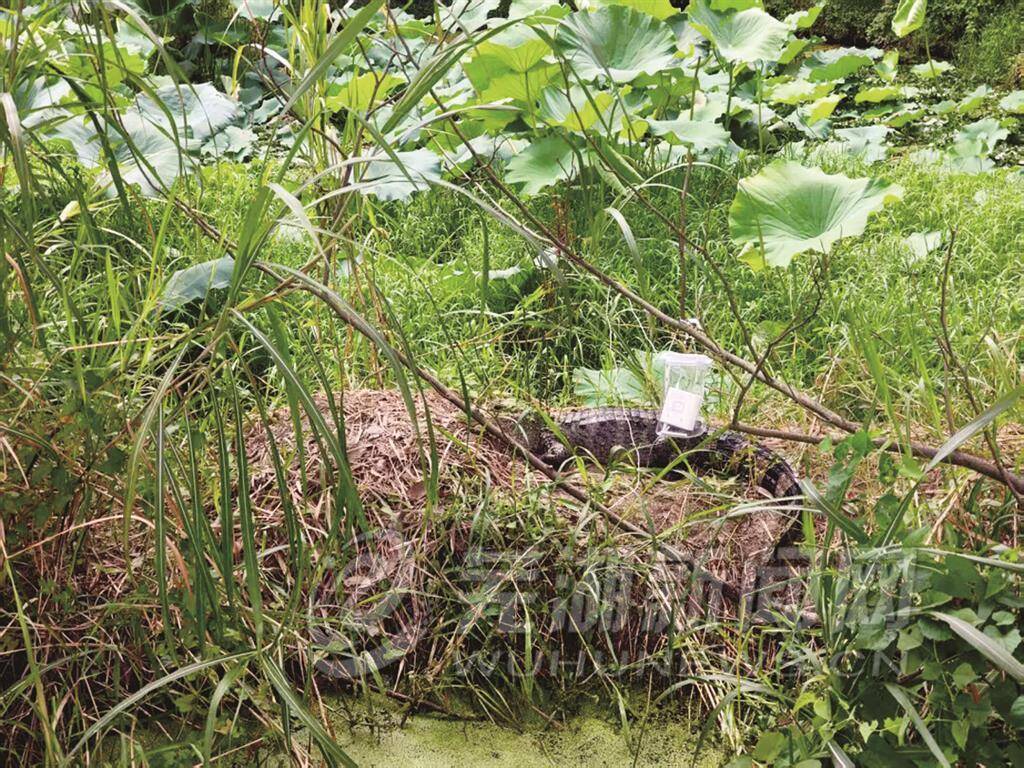 在另一处塘口,一位非常有“责任心”的母鳄正寸步不离地守着自己未出生的“宝宝”(如图)。它在日常活动的水域周边为产下的鳄卵搭建了窝巢,自己则潜伏在水里,只露出两只机警的眼睛,绿色的浮萍成了它的保护色,使其和池塘融为了一体。一旦有可疑生物经过,母鳄便会毫不犹豫地迅速跃上岸来保护窝巢安全。章燕介绍,不同扬子鳄性格存在差异,在野外环境中,母性强的护巢鳄鱼能显著提高幼鳄存活率,更易将后代平安抚育长大。