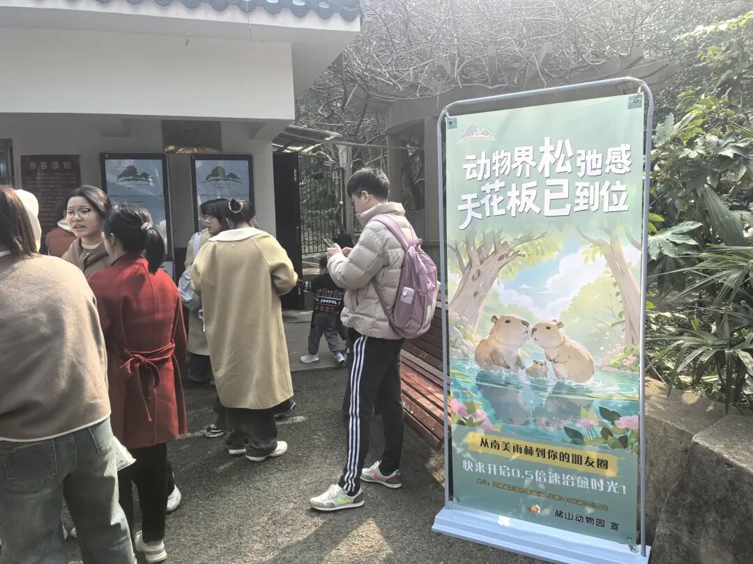 四肢短短、身材圆滚、外表呆萌、松弛感满满……近日,芜湖赭山动物园来了新成员——三只卡皮巴拉。目前“三小只”还在适应期,等到温度稳定在18度以上将与游客见面。卡皮巴拉是什么?“卡皮巴拉”是英文capybara的音译,意思为“水豚”,是一种原产于南美洲的大型啮齿类动物。“动物界松弛感天花板已就位”,3月8日下午,大江资讯记者来到赭山动物园,动物园门口已经立起了展板,告诉游客三只卡皮巴拉“从南美雨林来到你的朋友圈”。之所以说它是“动物界松弛感天花板”是因为其松弛自在、情绪稳定,主打一个“岁月静好”,这种独特的萌宠气质令它在社交媒体上迅速“圈粉”,深受网友喜爱,并由此衍生出了系列表情包及文创产品。独栋别墅、游泳池、各类食物……在与鹿舍临近的两间卡通房屋就是“三小只”的宿舍了。为了满足它们的生活习性,动物园还在宿舍前特别设置了陆地活动区和水面活动区,水面活动区是一个游泳池,因为它们爱洗澡;陆地活动区特意栽种了两棵热带棕榈树,还有一些供它们玩耍的木棍。记者现场看到,还在适应期的它们待在空调设置为23度的宿舍里,饲养员给它们提供了油麦菜、玉米、黄瓜以及各种水果等食物。在记者观察它们的20分钟里,它们是一个动作都没有,真的是“静如处子”。