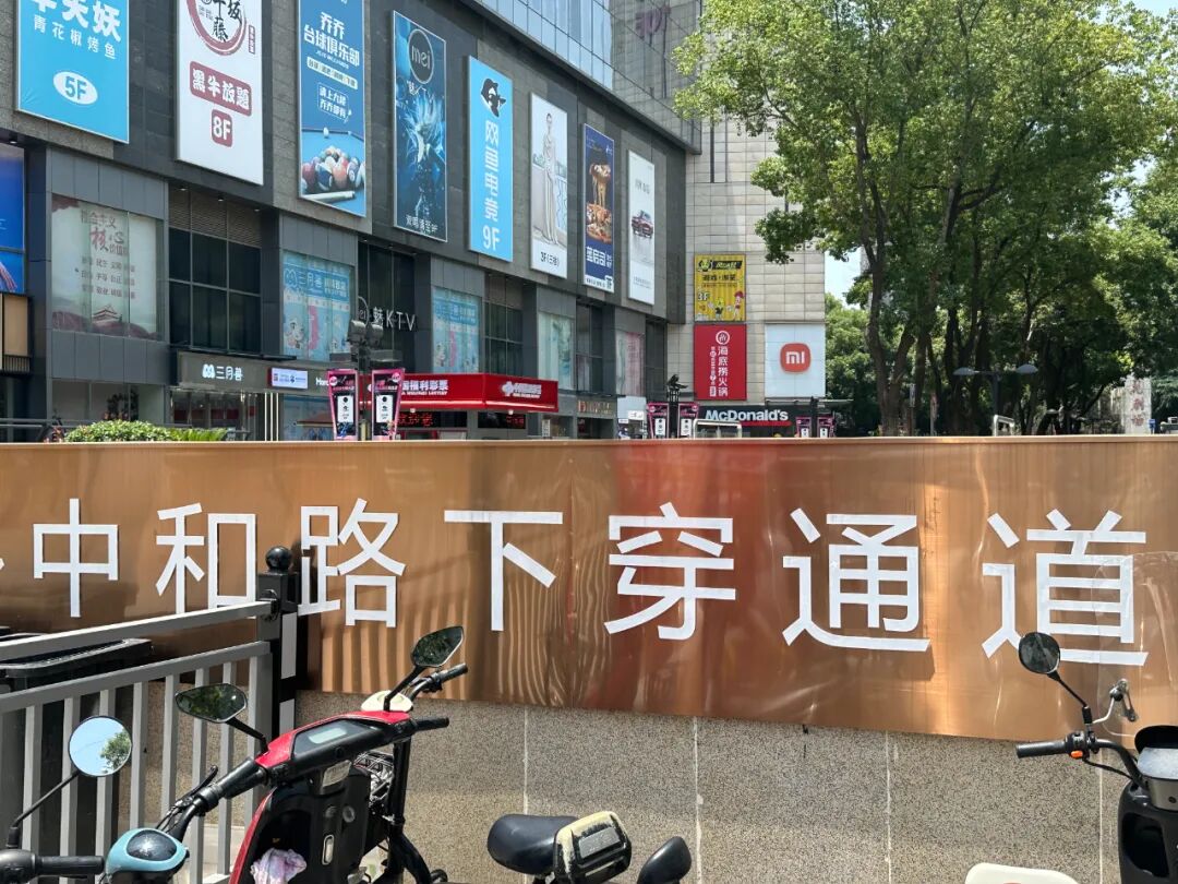 今年初,随着步行街地下停车场的开放,贯穿中和路的地下人行通道也一并建成开放,通过地下通道可实现步行街到华兴街一侧的自由切换。不过,上半年步行街启动了升级改造,大部分进行了施工封闭,为兼顾商家生意,仅临时搭建了一条游客通道,因此人行通道尚未真正完全发挥作用,人们穿行中和路仍从该路口通行。