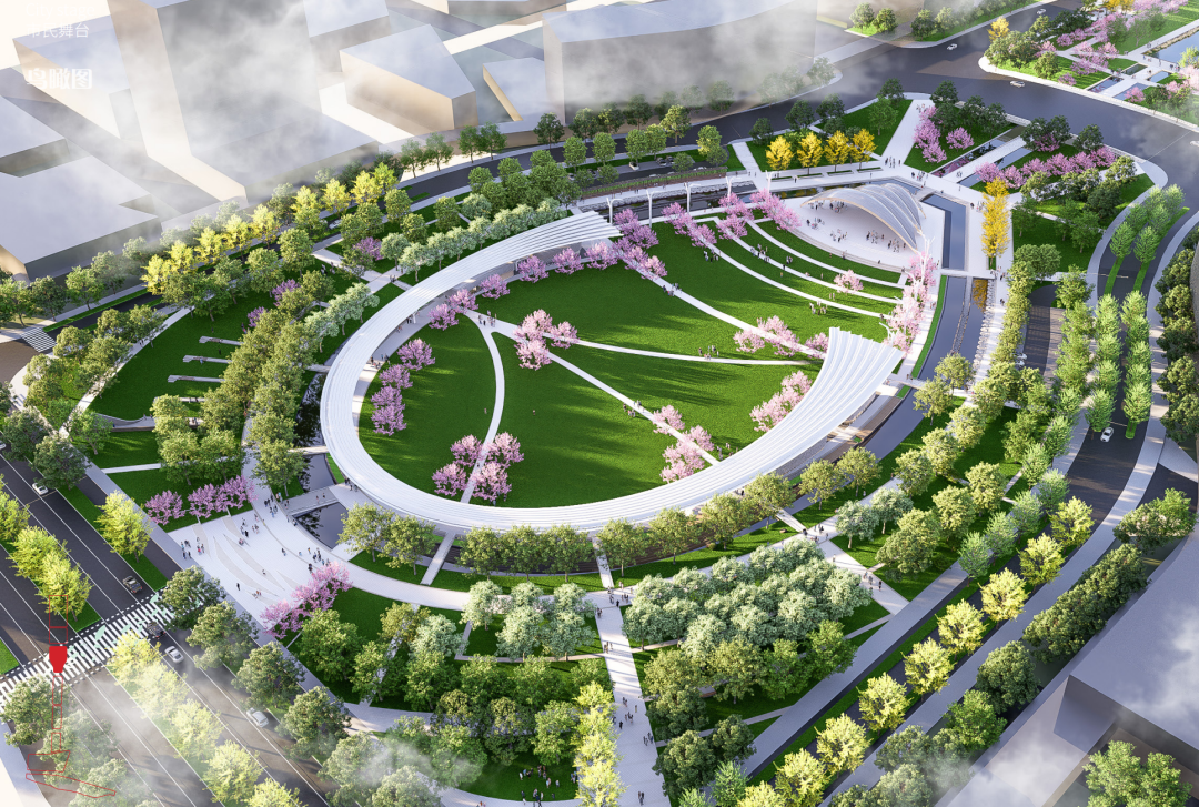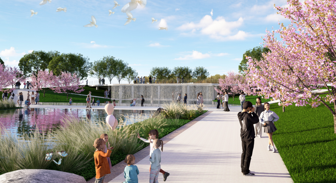 在项目设计方案中,人民公园对标的是美国休斯顿赫尔曼公园、广州塔城市轴线等世界知名的轴线公园。设计方创新提出了构建城市人文、活力与生态共生的 “脊柱”公园理念。其设计灵感来源于树的生长,将整个公园项目比作一棵“城市之树”,一期项目构成“树冠”,为城市提供丰富的公共活动空间;二期项目则作为“树干”,承载主要的人流与活动;自然公园和活水公园则如同“树根”,构建完善的蓝绿生态体系。
