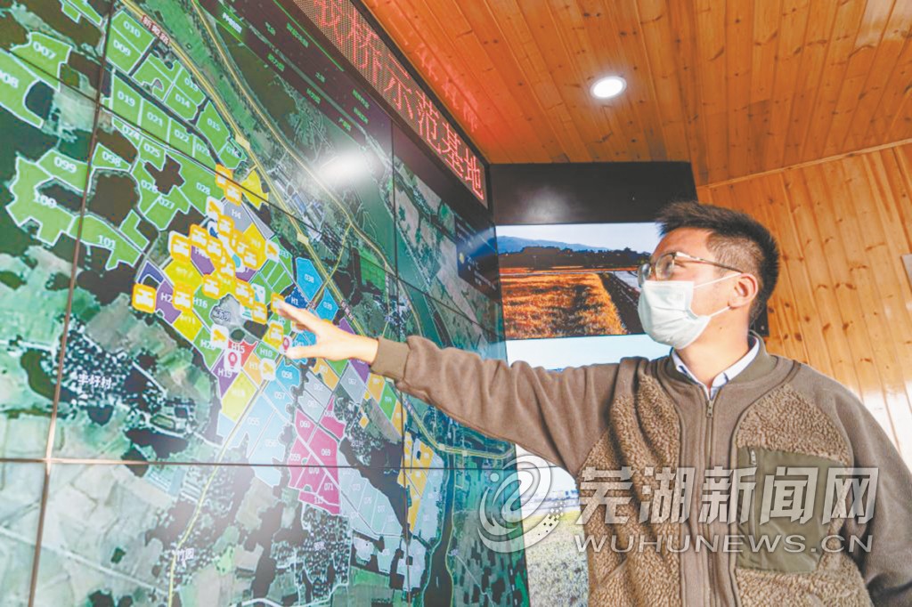 图为在芜湖市三山经济开发区中联智慧农业峨桥示范基地,“95后”新农人王磊在数据调度中心远程查看田间情况。