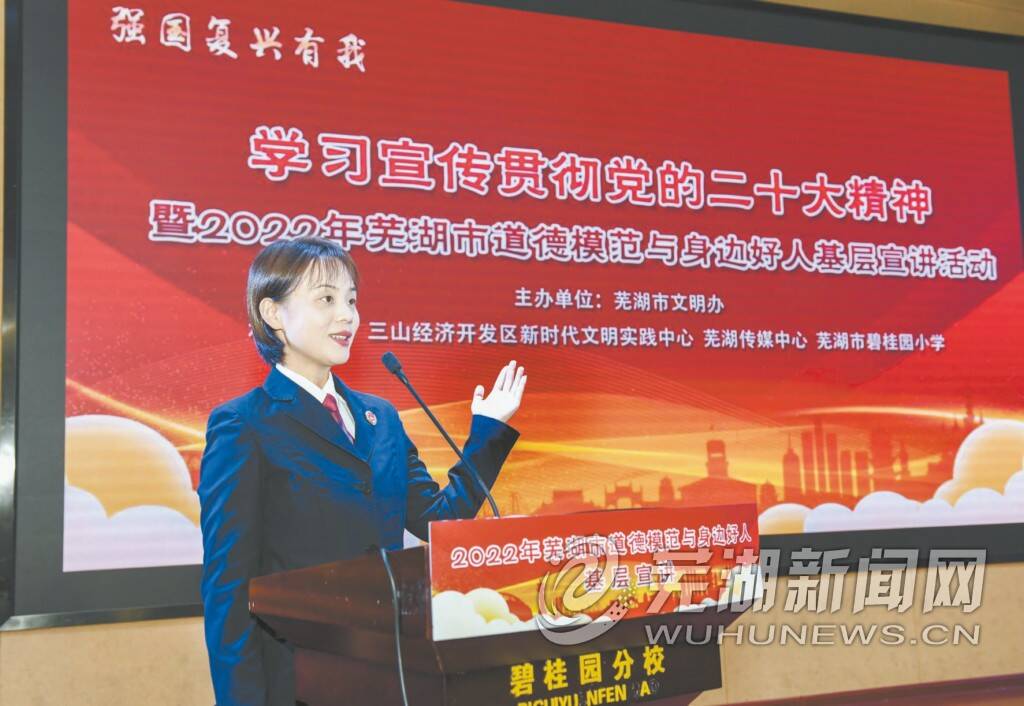 11月2日,“强国复兴有我 学习宣传贯彻党的二十大精神暨2022年芜湖市道德模范与身边好人基层宣讲活动”走进三山经开区碧桂园小学(如图)。宣讲团成员用真挚的情感、朴实的语言、生动的故事诠释了道德模范和身边好人热爱祖国、敢于奉献的家国情怀,坚定信念砥砺前行的奋斗精神,积极进取崇德向善的高尚情操。