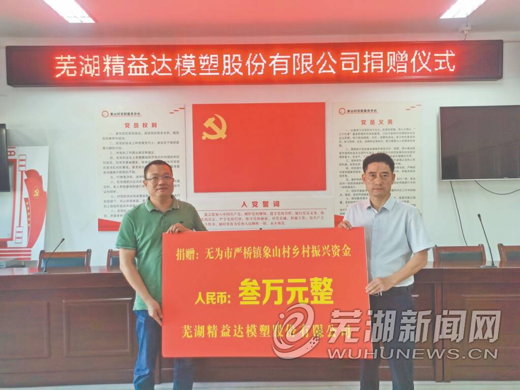 11月2日下午,芜湖精益达模塑股份有限公司一行5人来到无为市严桥镇象山村,向象山村委会捐赠爱心款3万元(如图),用于该村人居环境整治、乡村治理和资助两名大学生等项目。