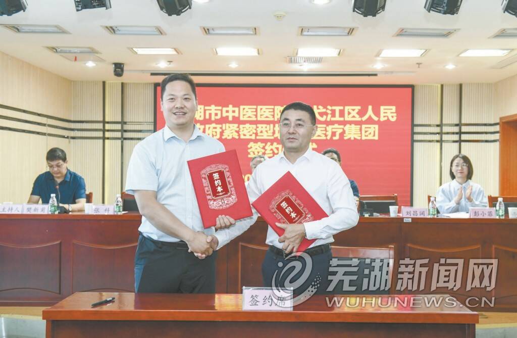 我市是国家81个紧密型城市医疗集团建设试点城市之一,市第三城市医疗集团由市中医医院与弋江区共同组建。芜湖市医管中心主任陈韧介绍,芜湖市中医医院与弋江区人民政府紧密型城市医疗集团签约,是加快推进紧密型城市医疗集团建设,推动优质医疗资源扩容下沉工作以来取得的实质性成果,将进一步推动市区医疗机构间的深度融合与协同发展,为构建更加完善的整合型医疗卫生服务体系提供有力支撑与保障,弋江区与牵头医院形成“1+1>2”的局面,为全面推进“健康芜湖”建设注入全新动力。