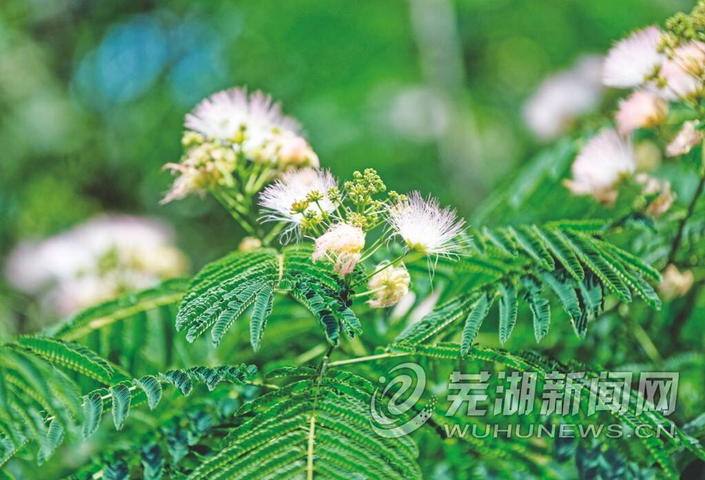 合欢因其树形开张,冠大荫浓,夏季花开时节色香俱佳,开花如绒簇分外美丽,在芜湖各地种植较多,既可以作为城市行道树,也可以作为观赏树,公园、小区绿化美化常见其靓丽身影。