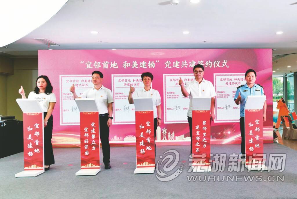 活动在舞蹈《江山》中拉开帷幕,获得了阵阵掌声。随后,“宜邻首地 和美建杨”党建品牌启动仪式掀起了当日活动的高潮,中移铁通有限公司芜湖分公司、中建八局芜湖数字经济产业园建设项目、赭麓街道市场监督管理所等单位负责人作为代表,上台共同进行党建共建签约。