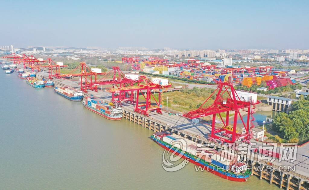 图为12月1日芜湖港朱家桥集装箱码头,岸边停靠多艘集装箱船,运输车辆往来穿梭,桥吊和轨道吊作业繁忙。