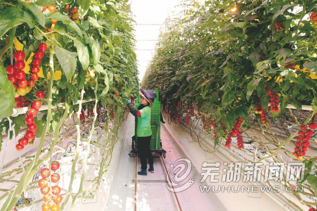 12月15日,在弋江区海螺白马山水泥厂智慧农业产业园的温室大棚里,工作人员正在采摘由二氧化碳作植物气肥培育出的番茄。