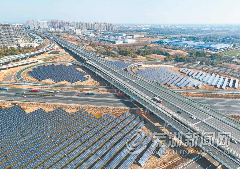 芜高速芜湖枢纽段,成片的光伏板成为一道亮丽的风景线。
