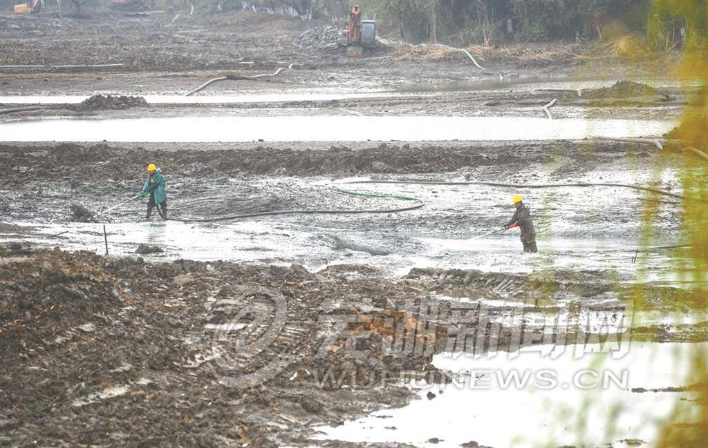 当日,记者在建设单位相关工作人员带领下在清淤现场看到,整个大阳垾生态湿地公园湖水均已排空,可看见湖底厚厚的淤泥。据介绍,由于多年水生植物枯萎腐烂沉积等原因,湖底淤泥最厚可达1米多,对水生植物生长、水体健康等造成不良影响,因此清淤改造势在必行。记者注意到,多名施工人员正在用高压水枪对底泥进行冲刷稀释(如图),随后将对这些底泥进行吸取。工作人员介绍,通过检测,这些底泥无重金属残留等危害,可以用于植物栽培。此次清淤工作将持续20余天。