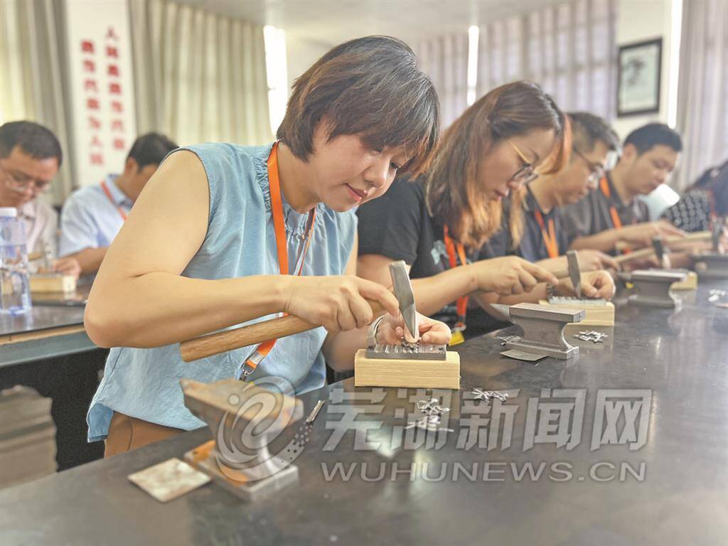 6月18日,市委党校第57期中青年干部培训班全体学员赴芜湖铁画传承基地开展现场教学。学员们现场了解了芜湖铁画的发展史和铁画锻制技艺的传承与创新,还亲身体验了芜湖铁画的制作,感受国家级非物质文化遗产的独特魅力。图为学员们体验芜湖铁画的制作。