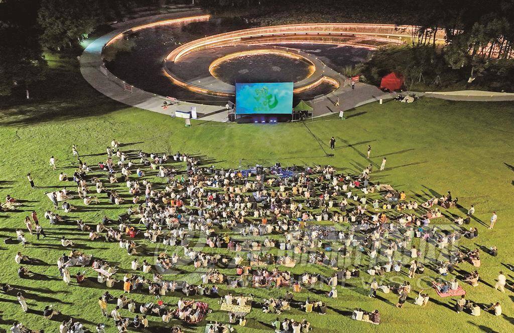 傍晚,暮色尚未掩盖天空,神山公园南门不时有市民进入,有的夫妻俩带着1个娃,有的甚至带了大大小小3个娃。爸爸妈妈挎着包,孩子们有的背着小水壶,有的还拎着水果零食,一路说说笑笑。他们穿过公园的小桥,走过树木葱茏的小径,很快就来到莲心舞台前观影草地上。从包里拿出野营垫铺开来,一家人舒舒服服坐在上面,喝着水、吃着水果,等待影片开始。细心的妈妈还会拿出团扇给孩子扇一扇风。如果此时从空中俯瞰,草地上划好的观影区域内有许多这样一块块的野营垫,坐着一家家父母孩子,超有爱超有趣。