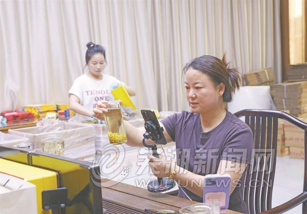 8月26日,三山经济开发区峨桥茶叶市场内,茶商通过网络直播销售茶叶,市场呈现出“淡季不淡”的良好势头。近年来,该市场积极推进转型发展,越来越多茶商加入电商行列,通过“线上+线下”融合模式拓宽茶叶销售渠道,持续推动茶市繁荣向好。