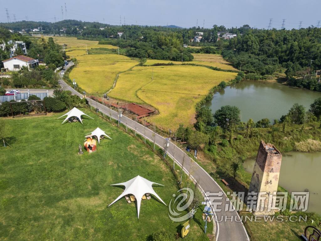 位于彩陶源村的生态营地与金色稻田相映成趣。 长沙晚报全媒体记者 郭雨滴 摄