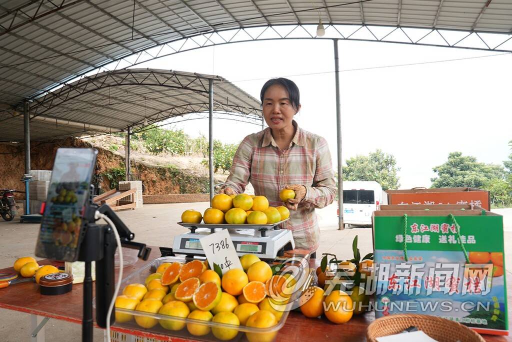 “家人们看过来,自家果园刚摘的东江湖蜜桔,皮薄肉嫩,汁水足!”来到刘丽的果园,她正在电商平台直播。