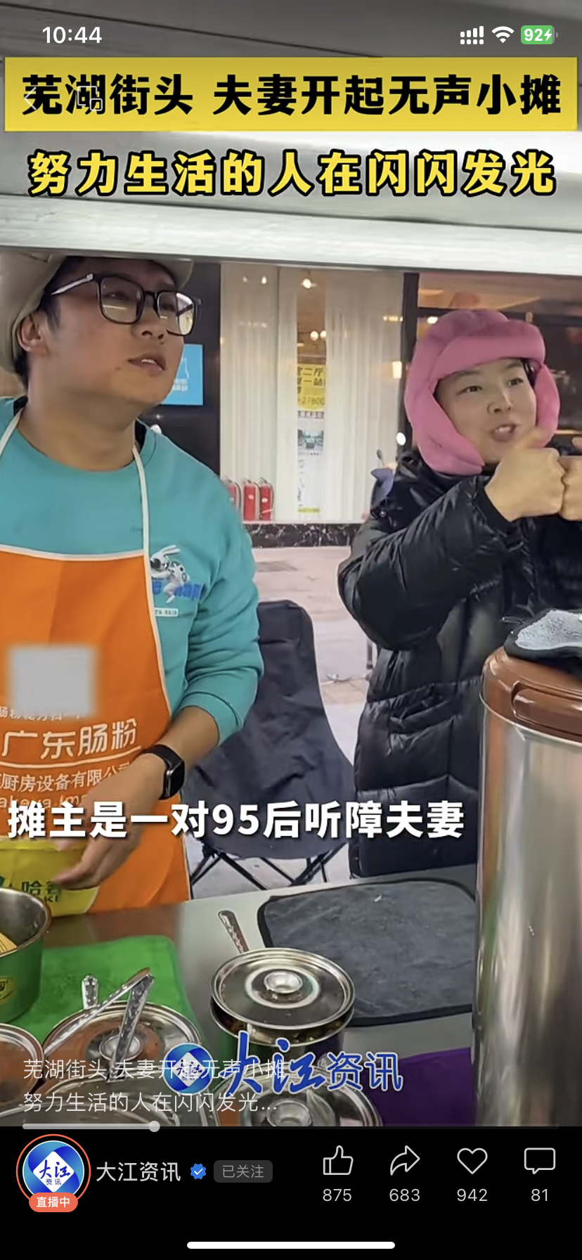 彰显人文关怀,强化以人为本的理念。大江资讯在报道中注重展现人的奋斗历程、成长故事,激励人们追求美好生活。2024年1月,大江资讯发布《芜湖街头 夫妻开起无声小摊努力生活的人在闪闪发光》等稿件,聚焦夜市里一对外地95后听障夫妻,在冬日里努力靠自己的双手摆摊,呈现出积极阳光的奋斗者缩影,全网点击量超过百万。展现了人性的美好和城市的人文关怀。